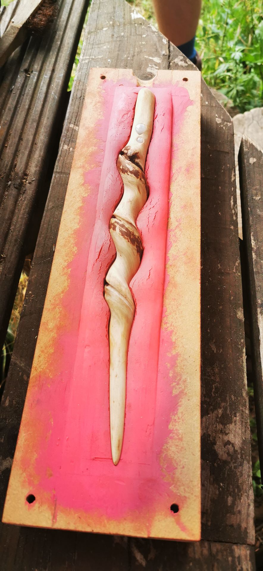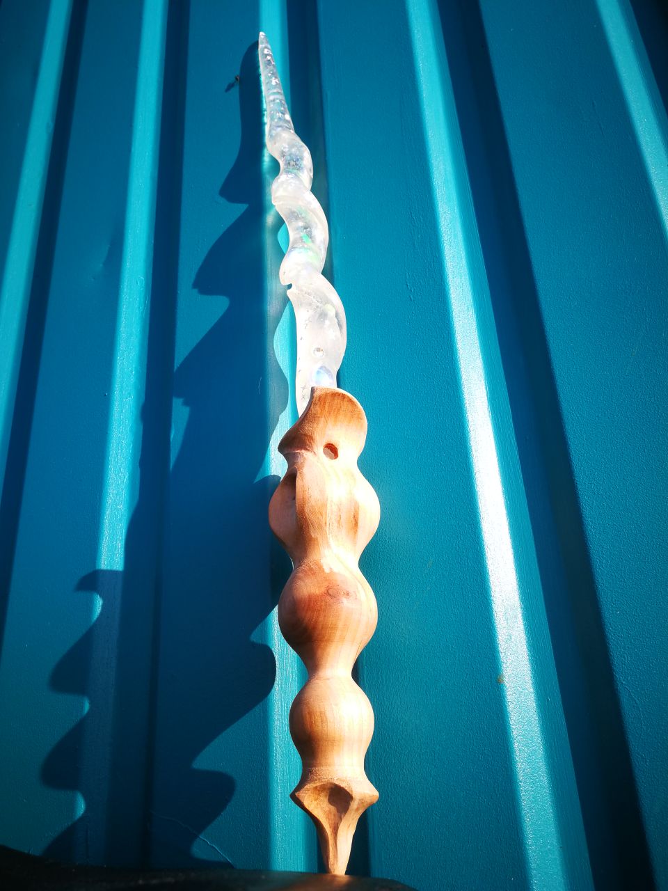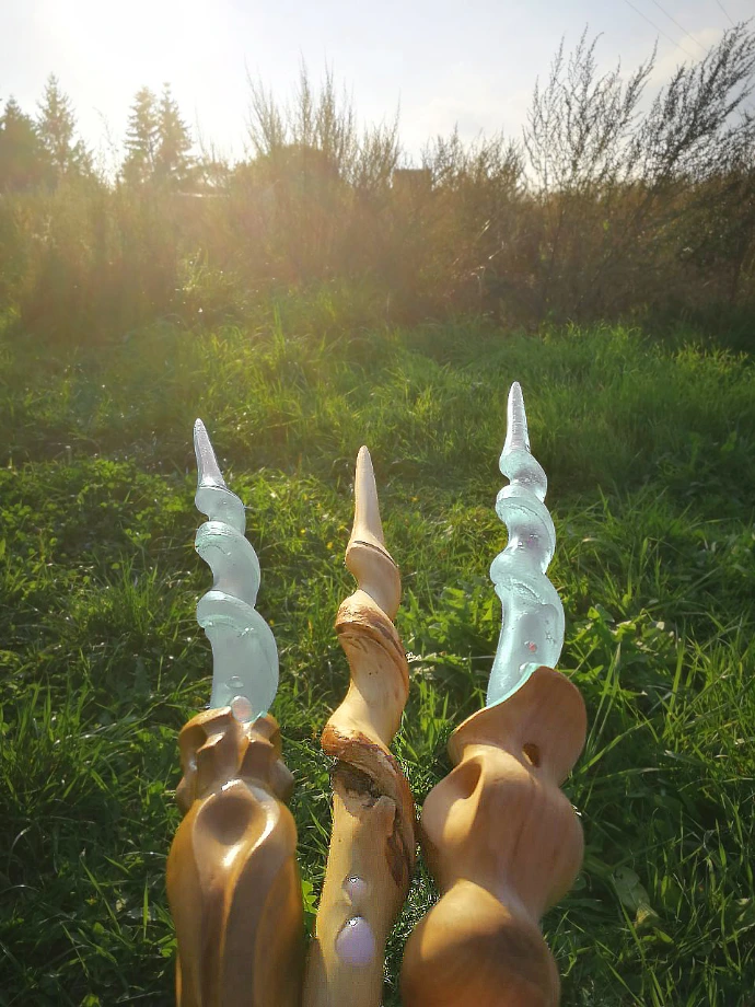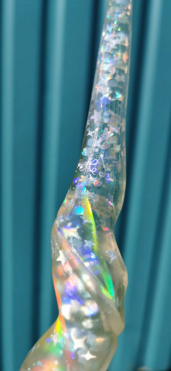 Mittels einer präzisen Silikonabformung erwecken wir diese besondere Wuchsform im Epoxydharz zu neuem Leben. Durch die künstlerische Magie von Crown Yourself by Dakini Agency werden feinste „Sparkles“ und magischer Feenstaub eingebettet, die das Licht einfangen und die Vision des Stabes zum Strahlen bringen.