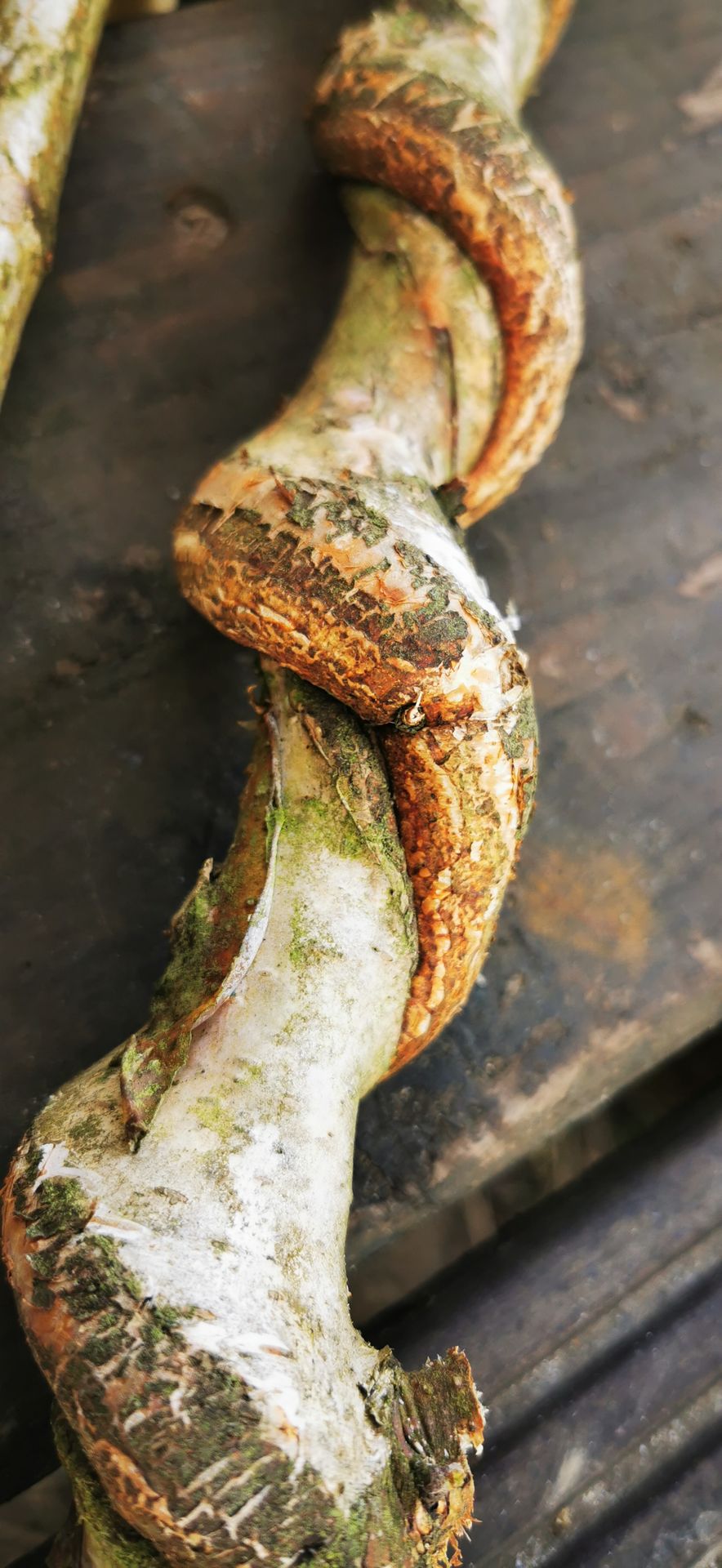 Der kristalline Part des Stabes erzählt eine faszinierende Geschichte des Waldes. Er ist das Abbild eines Birkenastes, der durch die Waldrebe geformt wurde. In einer ewigen Linksdrehung umschlingt sie den Baum und zwingt ihn in eine spiralförmige Wuchsform – ein seltener Ausdruck von Kraft und Anpassung.